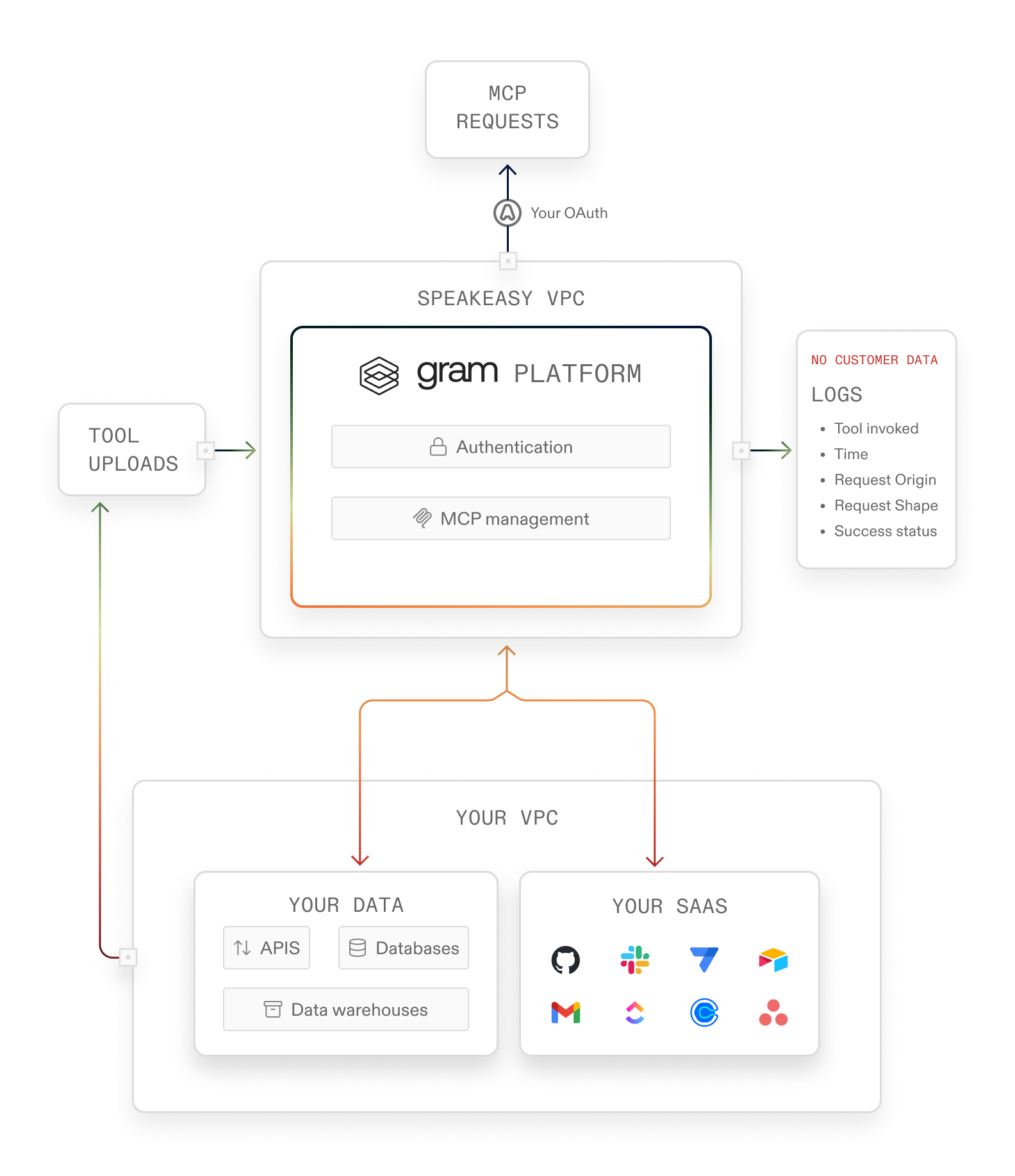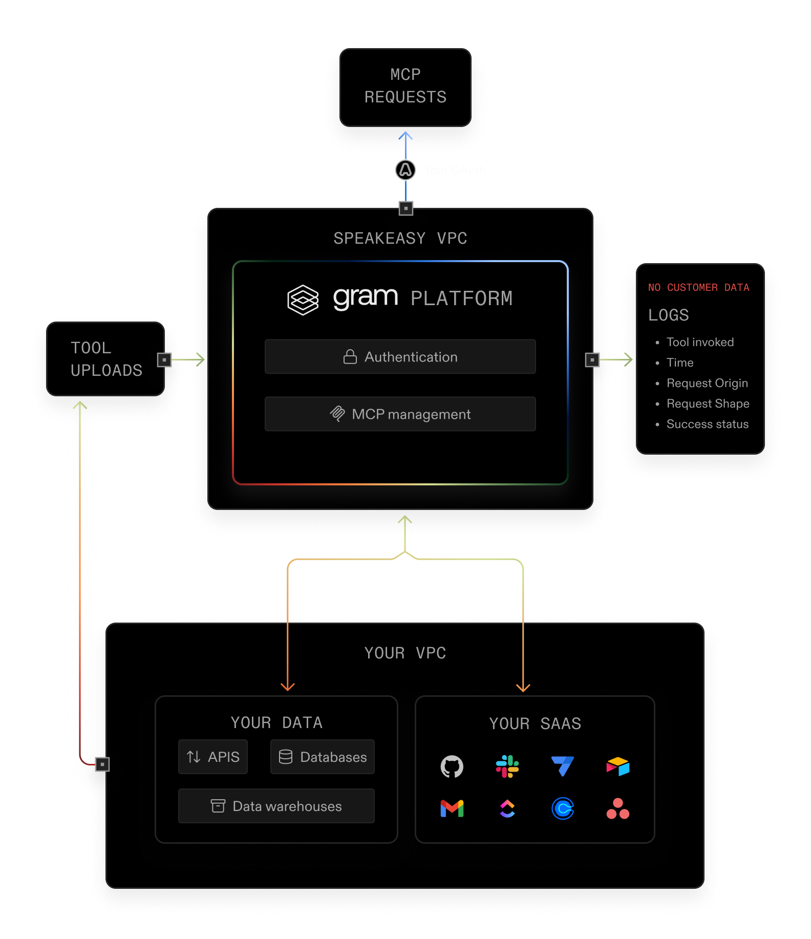 Gram is designed as a high-performance, security-first, serverless tools platform. It routes requests from a hosted MCP server (often hosted at mcp.your-company.com) to production APIs, following all modern security practices for web application development and data storage.